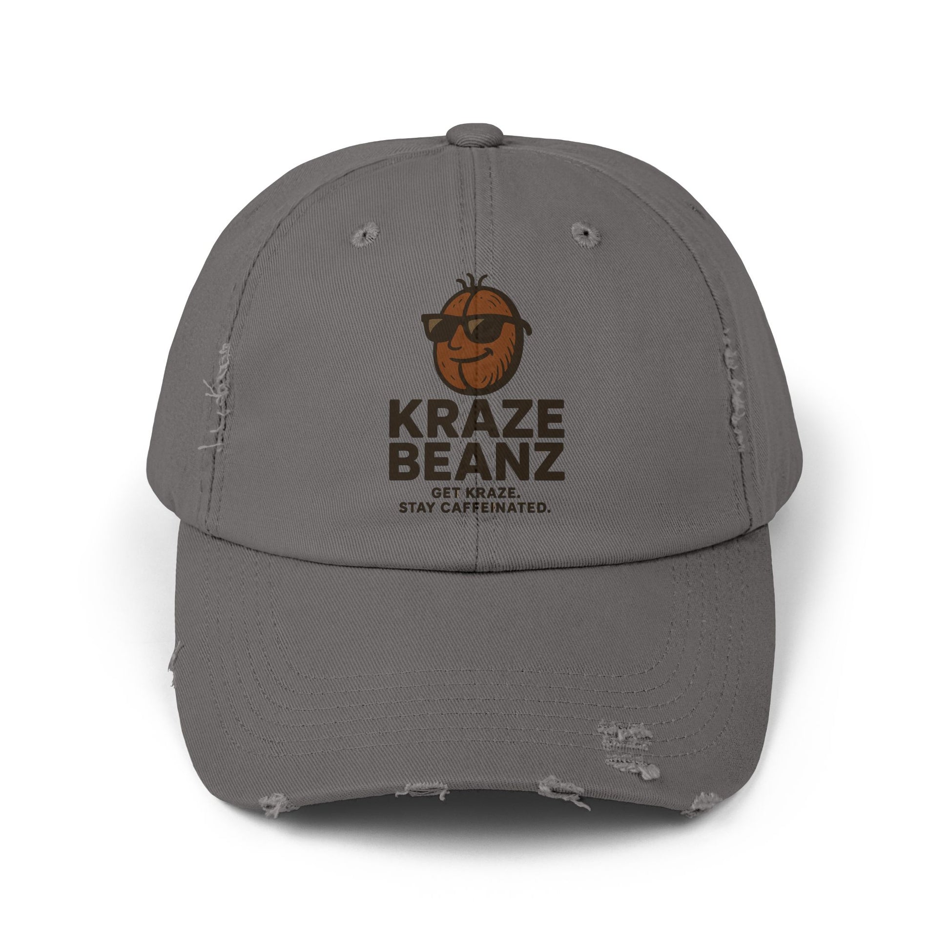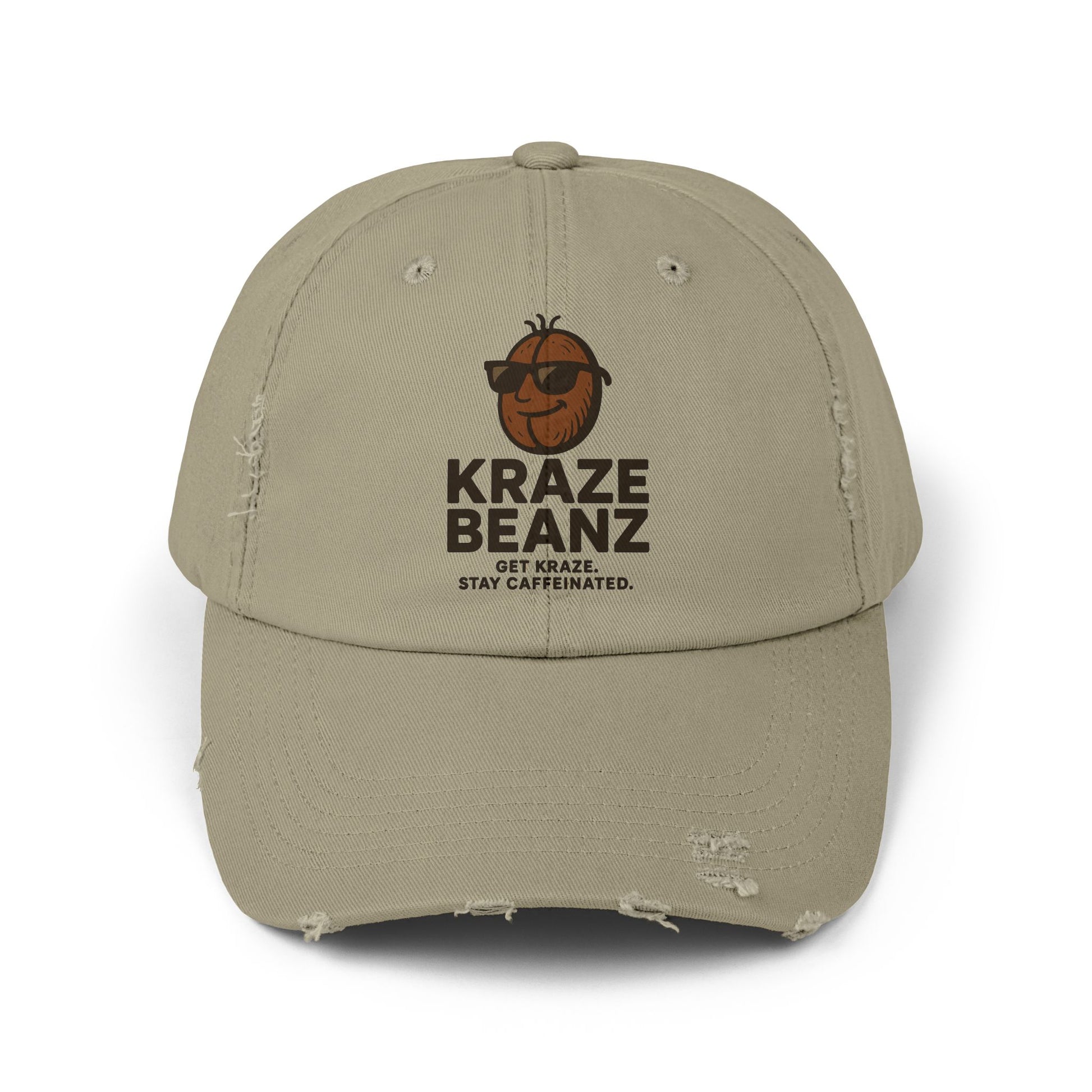 Kraze Beanz Distressed Cap — Vintage Coffee Logo Hat ("Kraze Beanz: Get Kraze. Stay Caffeinated.")